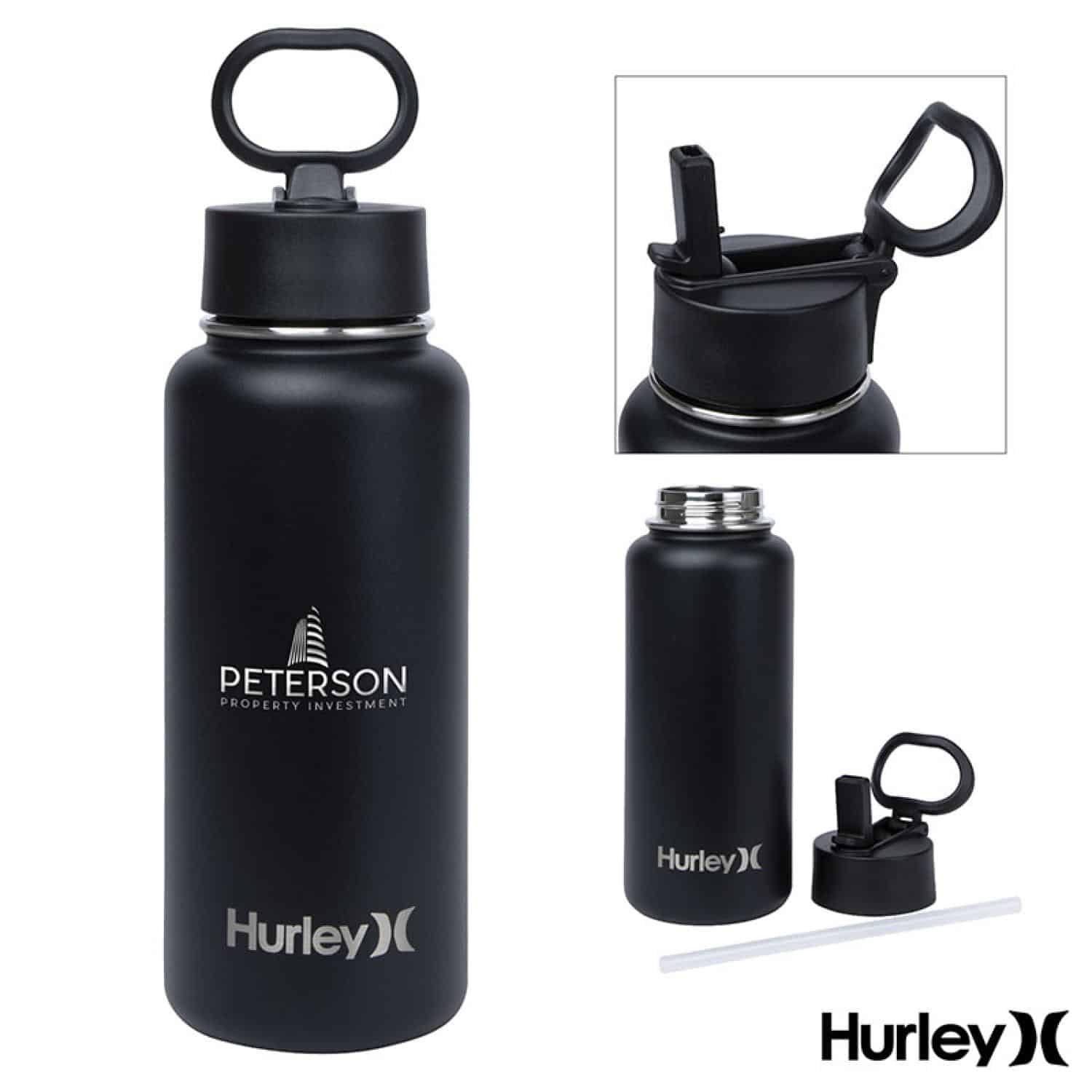 The Hurley Oasis 32 oz. Water Bottle is designed for anyone wanting to stay well-hydrated throughout the day. Whether on the beach between rides, at the gym, on the trail, in the car or at your desk, its double wall, 18/8 stainless steel vacuum insulated construction with copper lining will keep your cold drink cold for up to 30 hours. The screw-top flip straw lid can be operated with one hand for easy sipping and the hinged handle is convenient for easy carrying and traveling. The 32 oz. Oasis. Complies with Prop 65. 4 13/16″ W x 10″ H x 3 1/2″ D