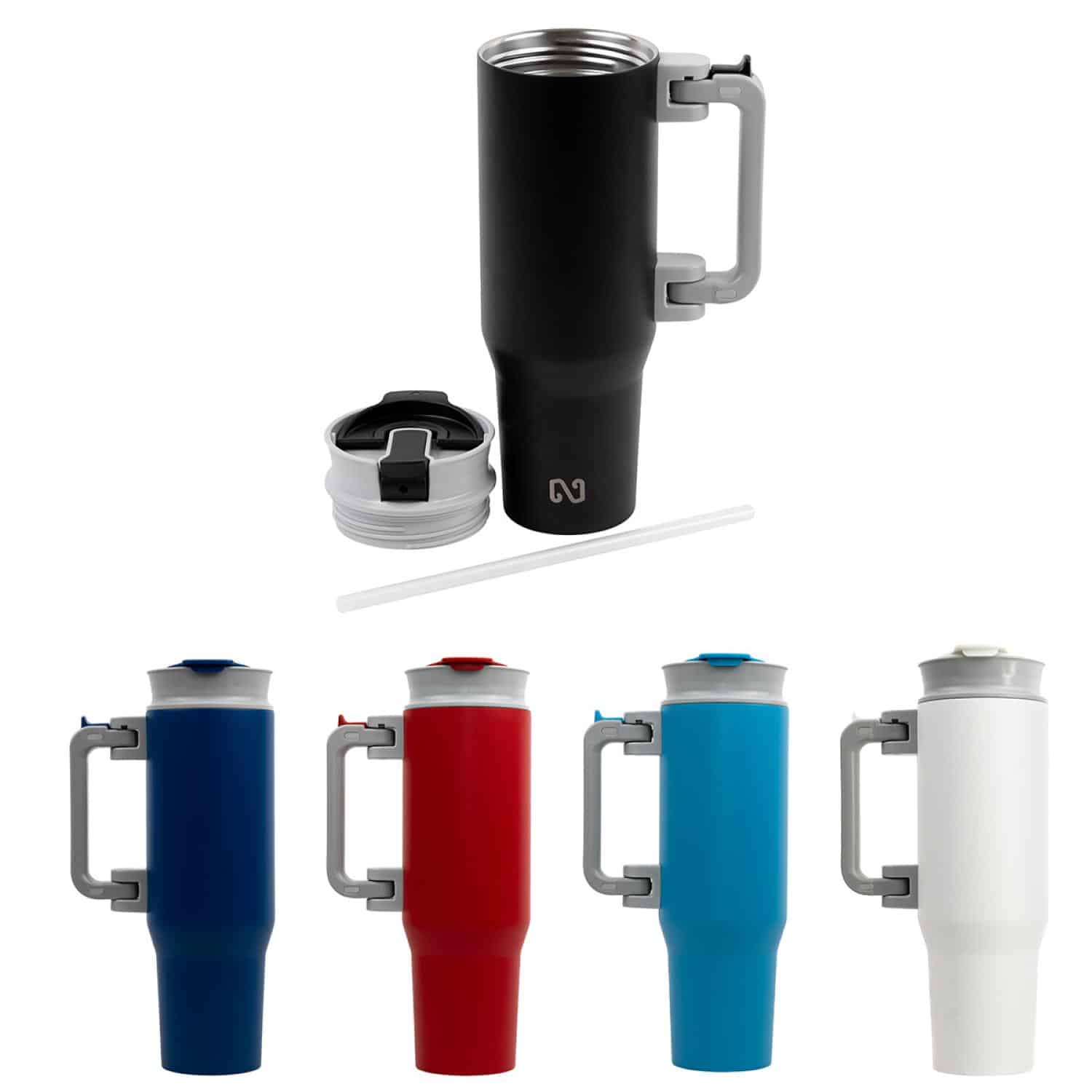 The NAYAD® Genesis 40 oz Stainless Steel Double-Wall Mug features an innovative foldable handle for compact storage and portability. Crafted with rust-free 18/304 stainless steel and a powder-coated matte finish, its heavy-duty 4 mm inner and 5 mm outer walls offer exceptional durability. Double-wall and copper-lined insulation keep beverages hot for 6 hours or cold for 10. Includes spill-proof dual-function and straw lids, lead-free vacuum tech, and car cup holder compatibility. FDA certified. Complies with FDA, Prop 65. 11.5″ H x 3.75″ Diameter